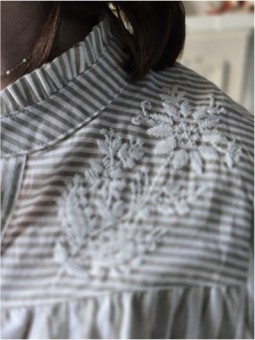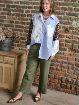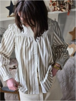 Blouse à rayures kaki et beige. Broderie sur le devant ainsi...