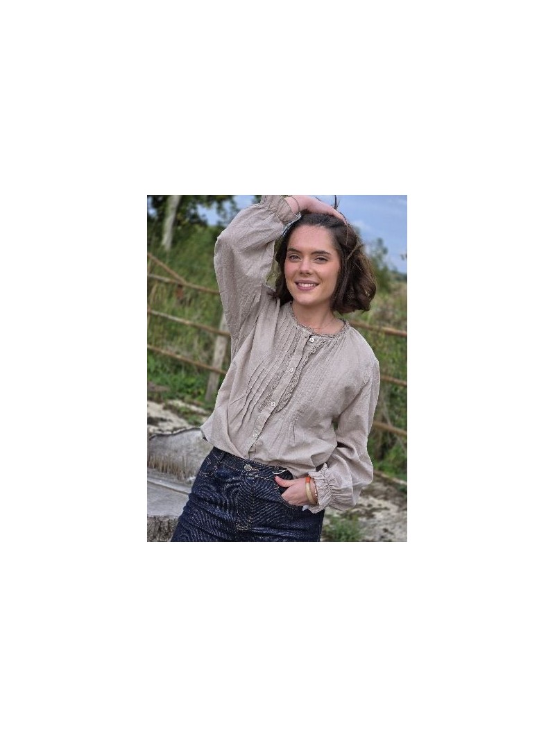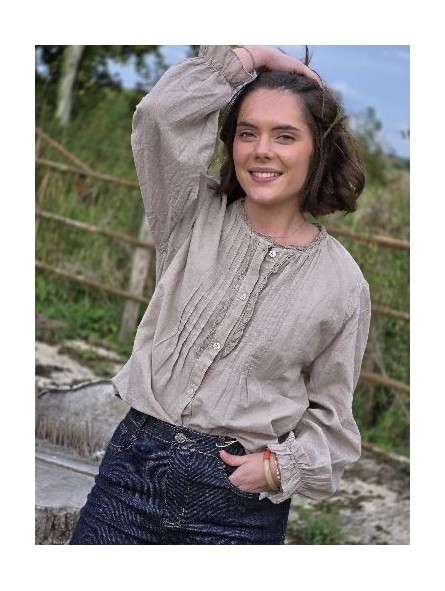 Plis religieuse sur le devant avec petit volant sur une partie de la patte de boutonnage